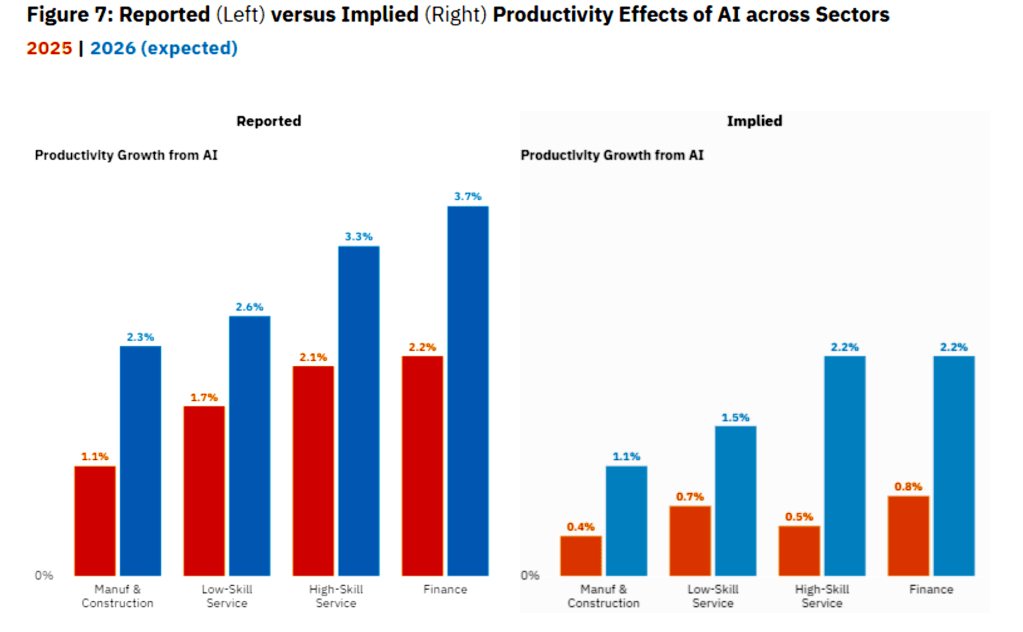 Based on surveys of nearly 750 executives, the research identifies a “productivity paradox.” Companies reported AI-driven productivity gains averaging 1.8% in 2025, but when researchers calculated implied gains using actual revenue and employment data, those gains were much smaller across all major industries—in both 2025 and 2026, the report found.