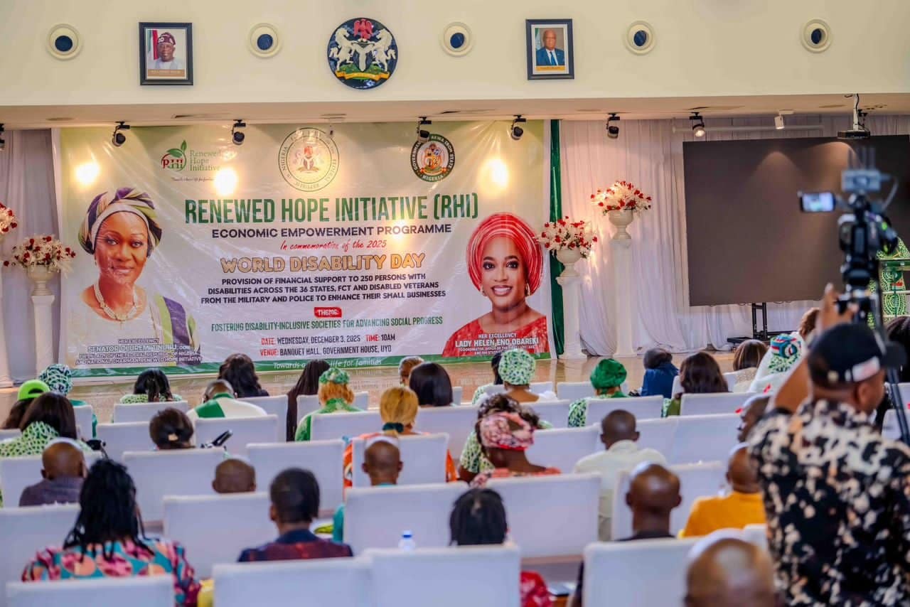 Mrs Tinubu, represented by the Akwa Ibom First lady designate, Helen Obareki, disclosed this at Government House Banquet hall, Uyo, Akwa Ibom State on Wednesday, during the disbursement of N200,000 Business Recapitalization grants to 250 Persons with Disabilities in the state which coincided with 2025 Celebration of Persons with Disability themed: “Fostering disability inclusive societies for advancing social progress.”