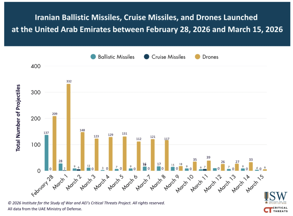 For example, drone attacks on the United Arab Emirates collapsed from 332 on the second day of the war to just six on Sunday. Ballistic missile attacks fell from a peak of 137 on the first day to four yesterday.